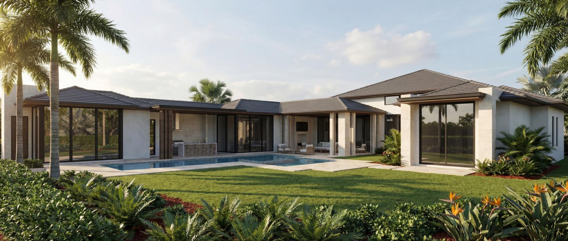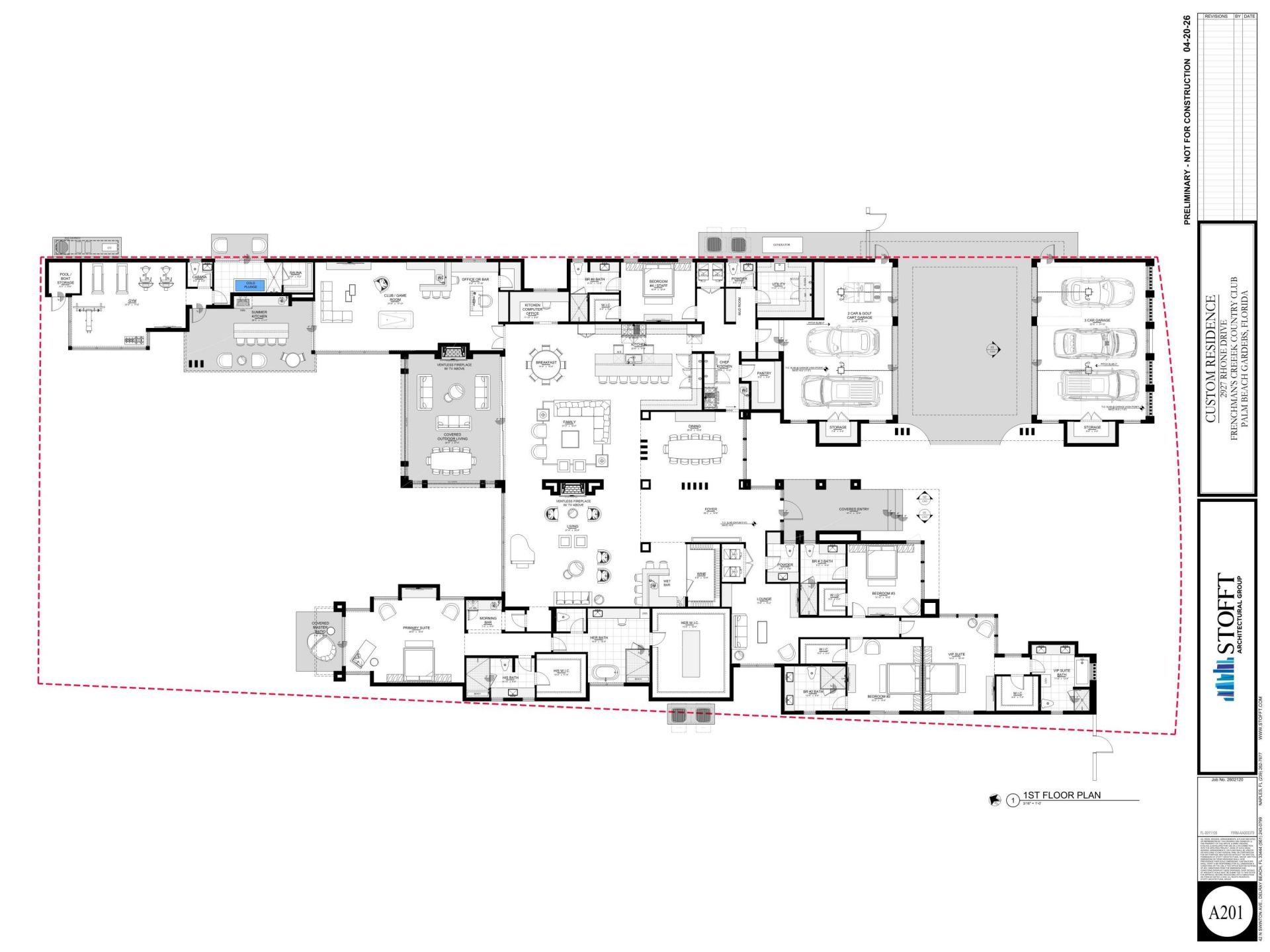 An exceptional expression of modern luxury, this to be built new construction estate offers an unparalleled lifestyle defined by scale, sophistication, and seamless indoor-outdoor living imagined by the Randall Stofft architecture firm. The private dock along 107 feet of navigable waterway offers effortless access, completing this amazing waterfront setting. Situated on over 3/4 of an acre and spanning over 8,400 square feet under air of refined interiors and nearly 12,000 total square feet under roof, this residence has been thoughtfully designed to elevate both grand entertaining and everyday comfort. Located on a navigable waterway in the prestigious Frenchman's Creek Country Club, thus home invites you to bring your boat and embrace the ultimate South Florida lifestyle. Presenting six bedrooms, seven full bathrooms, and three half baths, including a cabana bath, the layout offers exceptional versatility for both intimate living and large-scale hosting. A full size gym, an impressive space for a club or game room with a full bar and dedicated office space, exciting exterior features, such as, a cold plunge and sauna, distinguished VIP suite and a luxurious primary retreat, this home will be a true private resort for family and guests alike. The primary chef's kitchen serves as the heart of the home, showcasing top-of-the-line appliances, custom cabinetry, and an expansive layout that seamlessly connects to the main living spaces. Complementing the space is a fully equipped caterer's kitchen, offering additional prep space and premium finishes-ideal for hosting events with ease and complemented by a wine room and wet bar. The primary suite is complete with dual spa-inspired bathrooms, two oversized walk-in closets, a morning bar, and a secluded covered patio for tranquil mornings or evening escapes. Designed with wellness in mind, the residence includes a spacious gym room, cold plunge, and sauna, delivering a spa-like experience within your own home. Additional highlights include a dedicated office within the club room with full bar, abundant storage throughout, and two striking ventless fireplaces that add warmth and ambiance to the living areas. Outdoors, the estate transforms into a true entertainer's paradise. A covered summer kitchen, expansive lounge areas, and a stunning pool and spa with sun shelf create a seamless transition between indoor and outdoor living. Designed with the automotive enthusiast in mind, the property accommodates up to 8-9 vehicles under roof, including a five-car garage and dedicated golf cart garage. Embrace peace of mind, with impact glass throughout and a whole house generator. This is more than a home-it is a statement of prestige, craftsmanship, and elevated living. Frenchman's Creek Members enjoy the ultimate concierge lifestyle with resort amenities, state-of-the-art brand new clubhouse, two 18-hole championship golf courses-for only 600 homes. Numerous dining options, navigable waterways, racquet sports, social events and so much more. The exclusive Beach Club, included with membership, located on beautiful Juno Beach allows use of pool, restaurant, beach attendant and water activities.